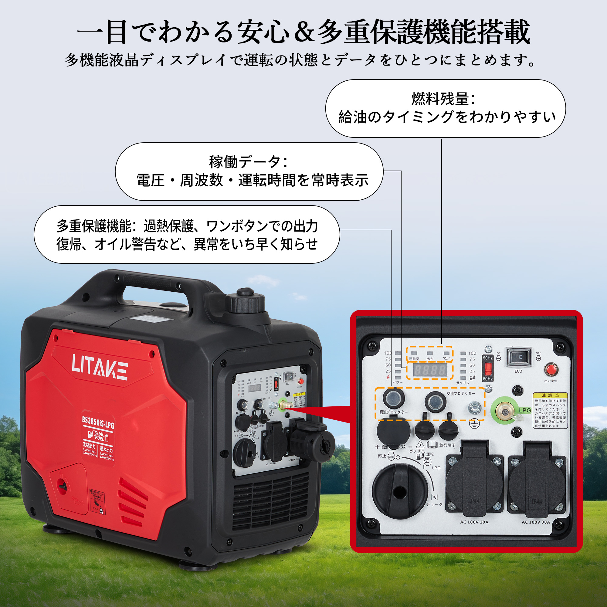 | ポイント2 | ★【多重安全機能で安心運用】 過負荷警告、オイル警告、過電流保護などの安全装置を完備。排気対策や感電防止設計も施されており、初心者の方でも安心。 | ||
