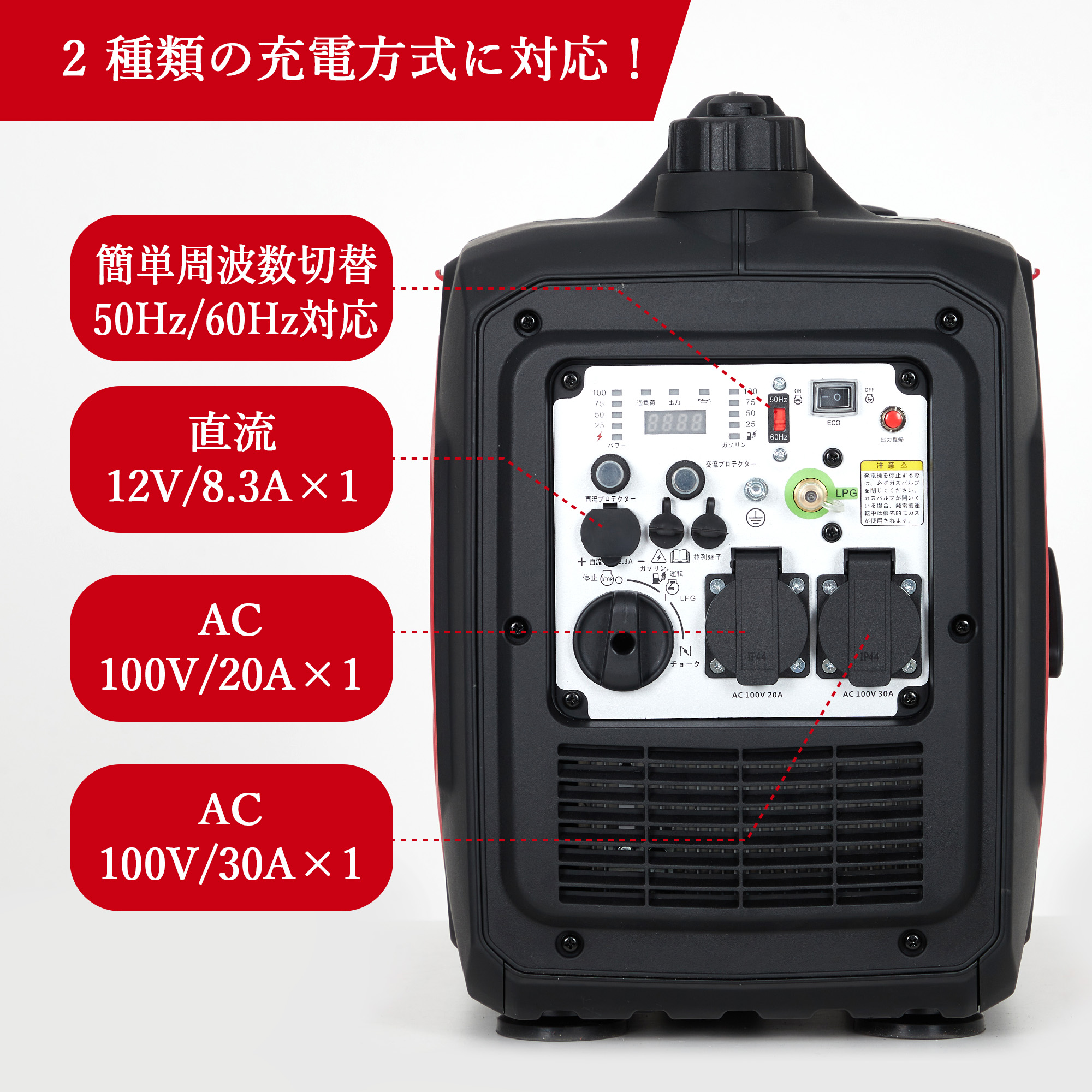 | ポイント3 | ★【ガソリン/LPガス両方対応で用途が広がる】 燃料の入手しやすさと使用目的などによって燃料を自動的に切り替えることができます。 | ||